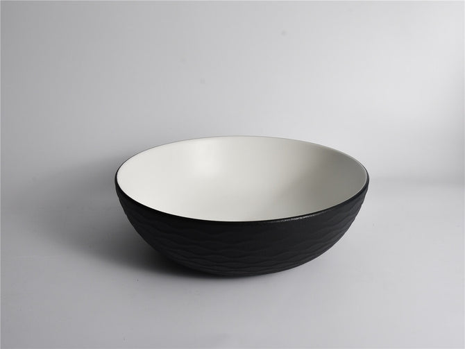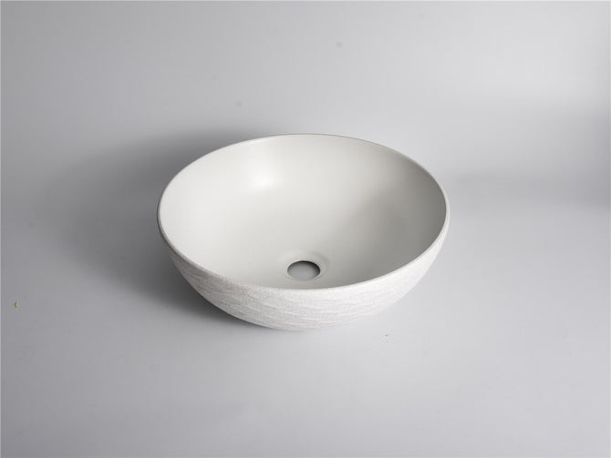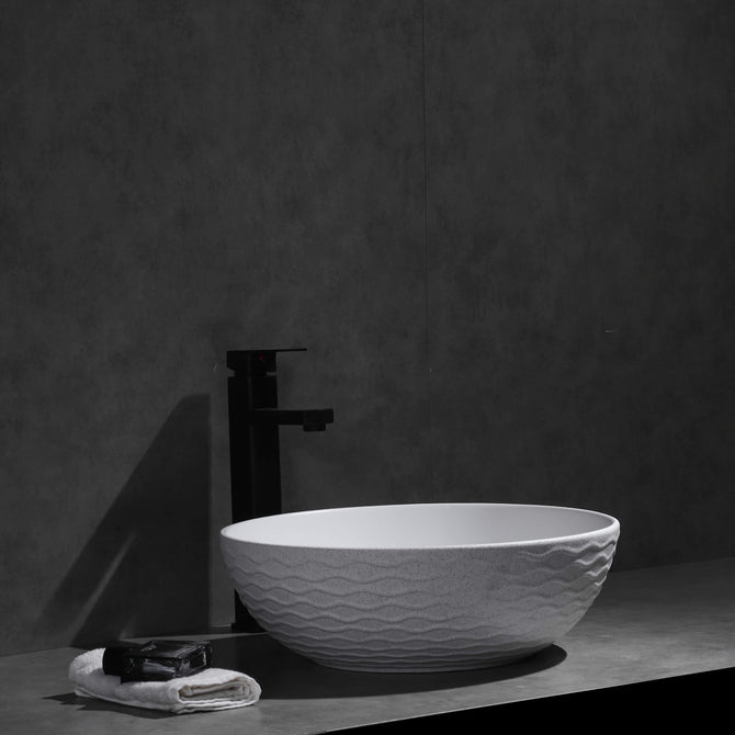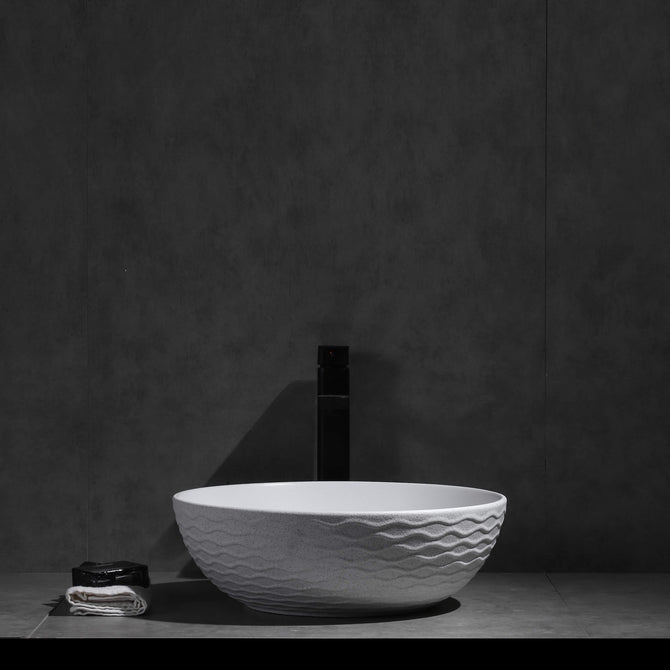 Product Description: Enhance your bathroom with the Claya Wavy Texture Basin, featuring a unique wavy design and a choice between matte white or matte black finishes. This round, above-counter basin combines modern aesthetics with functionality, making it a versatile addition to any bathroom setting. Crafted from high-quality ceramic, it ensures durability and easy maintenance.