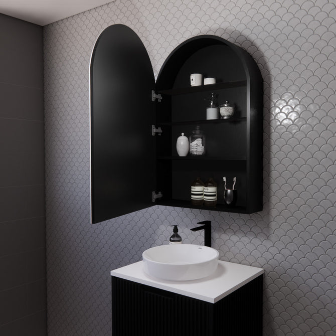 With its elegant arch shape and bold matte black finish, this Designer Shaving Cabinet not only enhances the aesthetic of your bathroom but also provides lasting functionality and style.